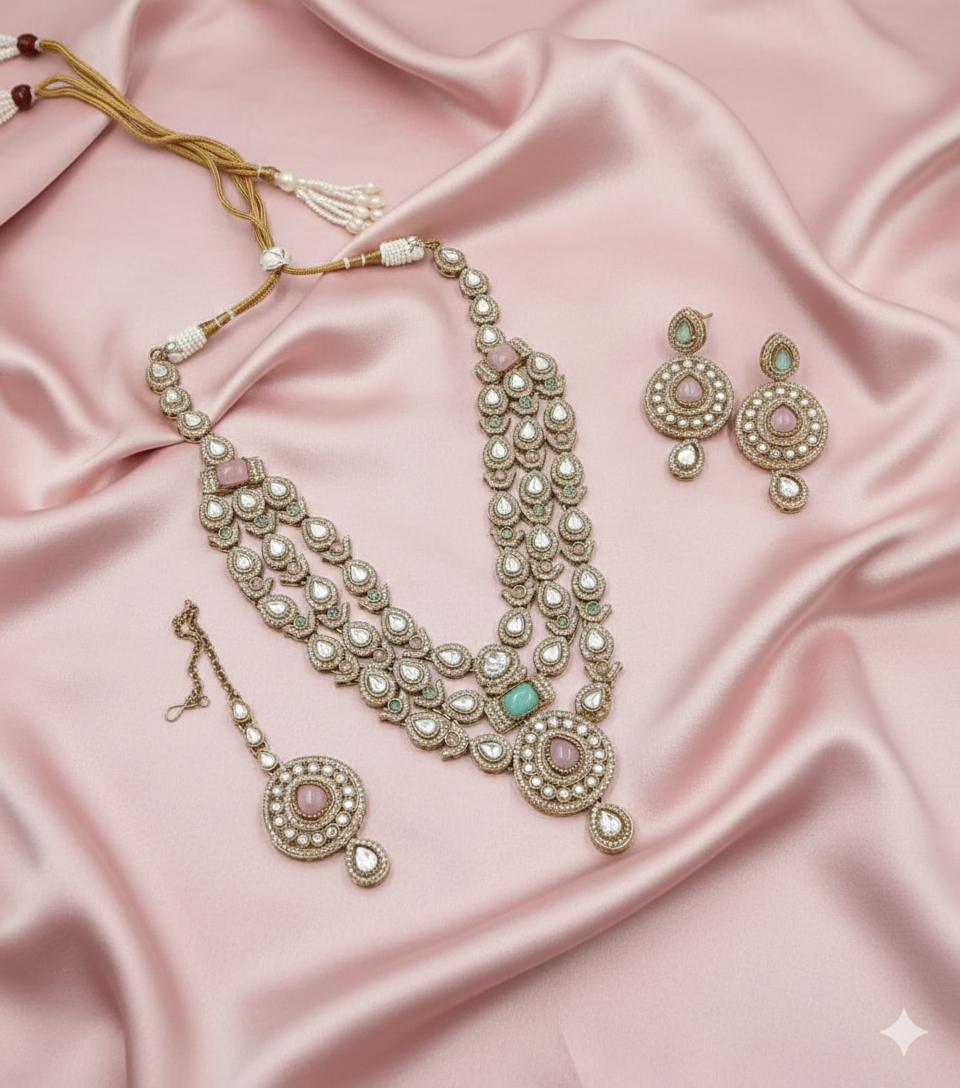 Graceful mehandi polish layered necklace set featuring white stones with soft baby pink and mint green accents.