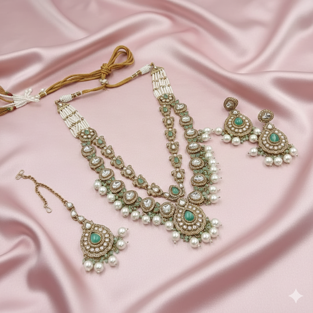 The set includes a matching pair of earrings and a coordinated maang tikka, making it a complete accessory for festive occasions, family functions, poojas, and wedding guest styling. The soothing mint green and white colour combination keeps the design subtle, elegant, and lightweight—perfect for those who prefer non-bridal, versatile jewellery. The adjustable dori closure ensures comfort and easy fitting.