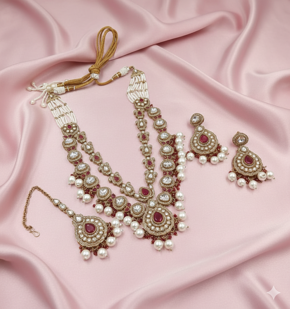 The design is enhanced with delicate white pearl drops that add movement and charm to the necklace, earrings, and matching maang tikka. The adjustable dori closure ensures comfort and a secure fit, making it suitable for long wear.