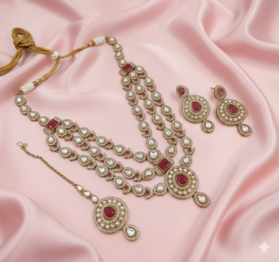 The matching earrings mirror the same circular motif with ruby red centers and white stone detailing, completing the set with perfect harmony. A coordinating maang tikka adds an extra touch of elegance, making this set ideal for weddings, festive occasions, and traditional ceremonies.