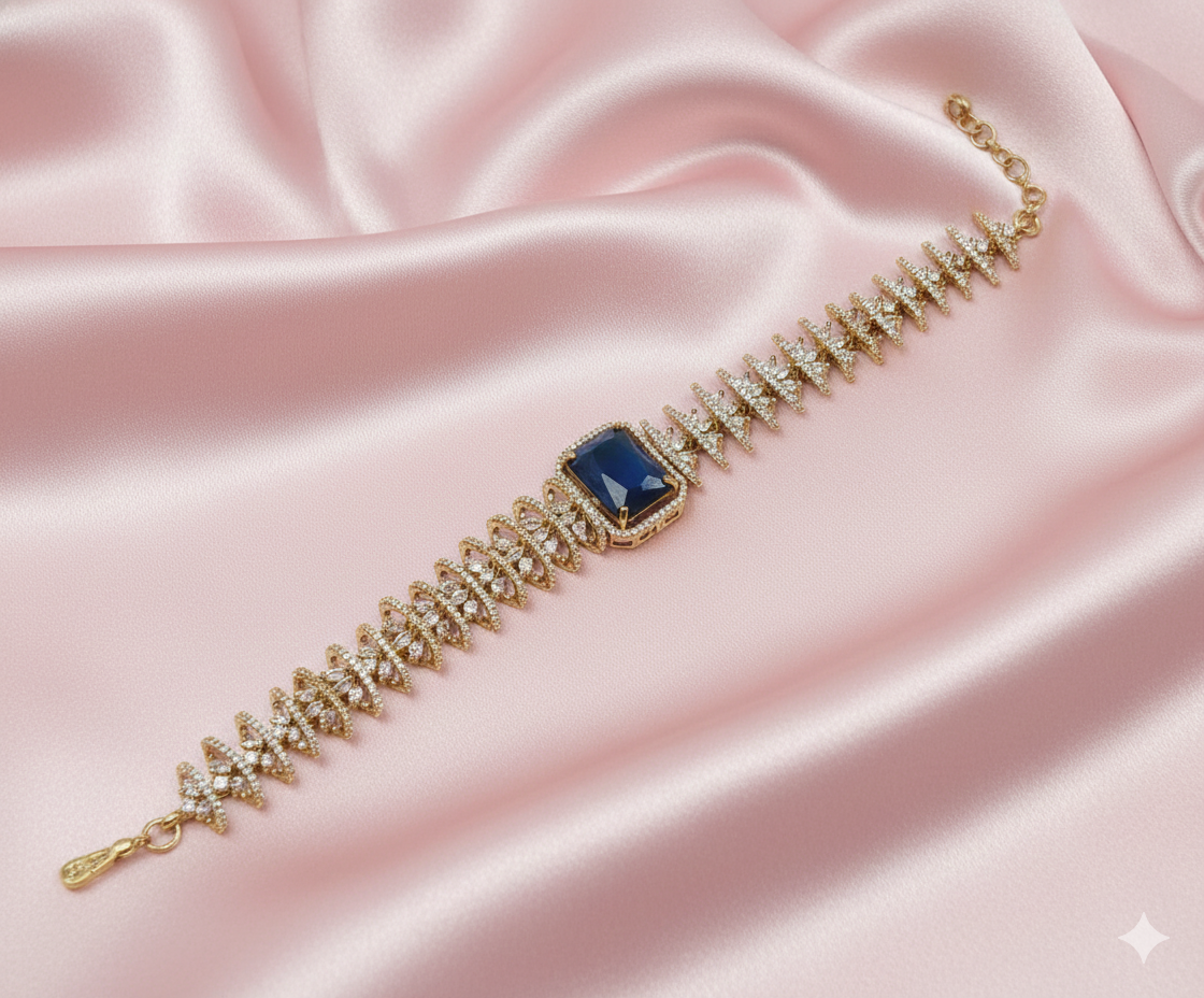 Perfect for weddings, festive occasions, evening parties, and traditional celebrations, this bracelet pairs effortlessly with sarees, lehengas, and elegant fusion wear. The refined blend of gold, white, and navy-blue hues gives this piece a timeless and regal appeal, making it a standout accessory for both day and night styling.