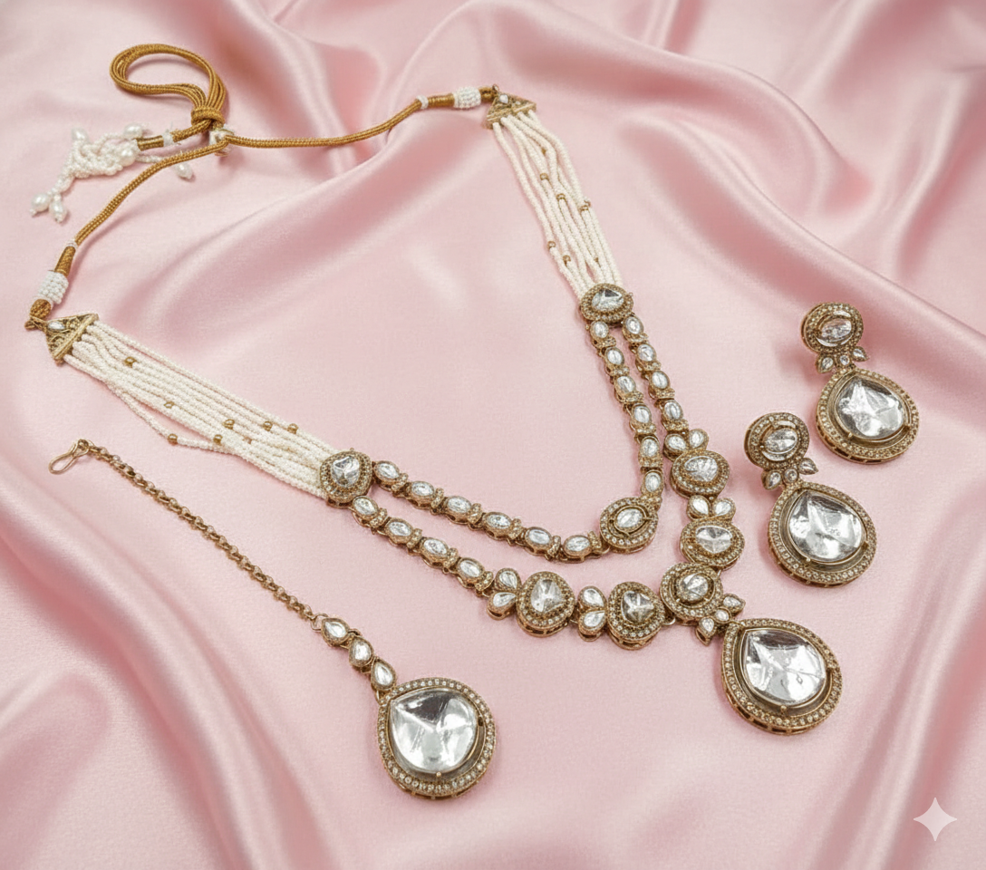 Elevate your celebration attire with the Mint & Rose Pastel Mehandi Polish Necklace Set. This piece features a unique dual-toned stone arrangement that balances soft pinks with refreshing mint greens. The antique “Mehandi” gold finish adds a vintage depth to the modern pastel palette. Hand-strung with fine white seed pearls, this set includes a layered statement necklace, matching drop earrings, and a dainty maang tikka, making it an ideal choice for daytime weddings and spring festivities.