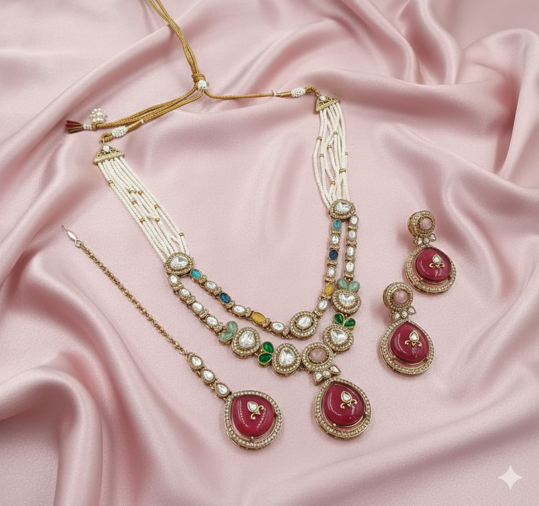 levate your festive look with the Mint & Rose Petal Necklace Set. This exquisite piece features a unique dual-toned design, alternating between soothing mint green and delicate rose pink cabochons. The stones are encased in an intricate antique gold-toned Mehandi finish and accented with shimmering Kundan-style crystals. Completed by five strands of fine white seed pearls, this set includes a layered necklace, matching drop earrings, and a coordinated maang tikka for a complete, ethereal ensemble.