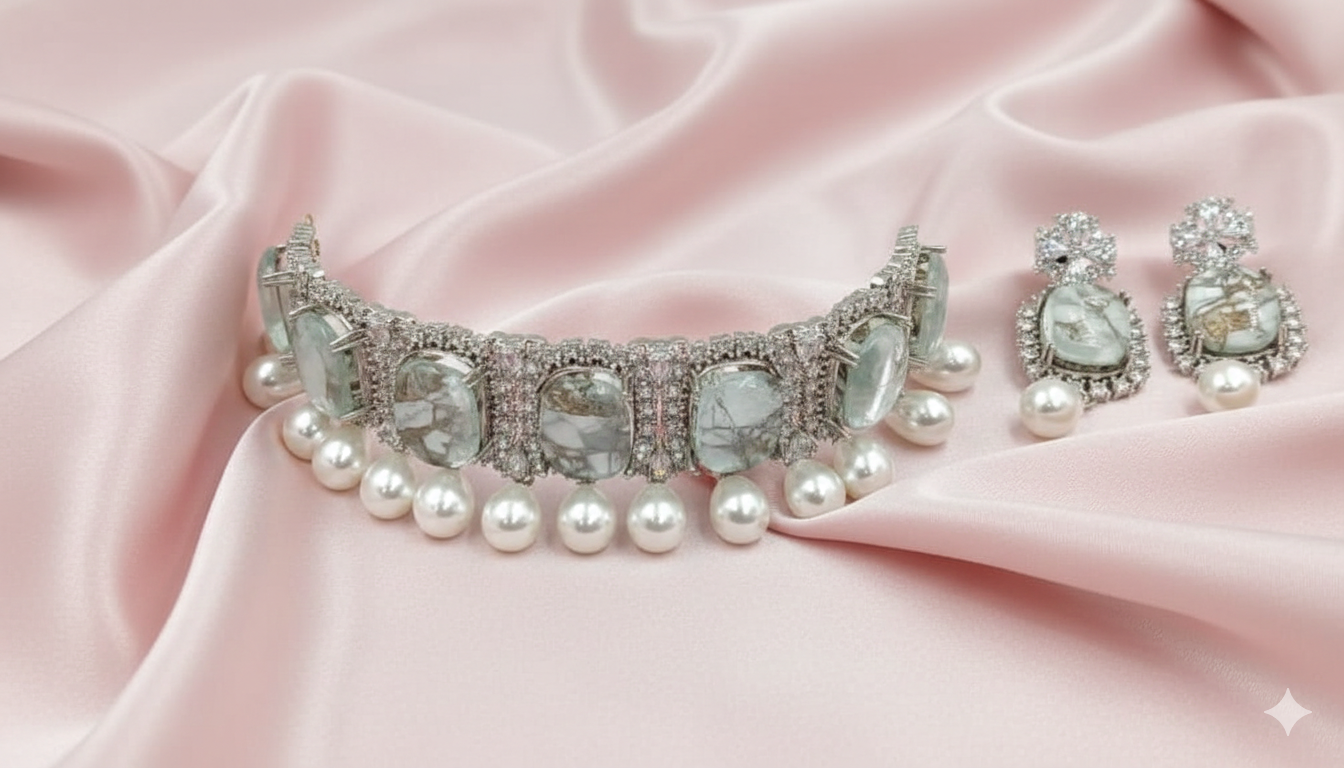 A sophisticated, silver-plated choker set featuring serene mint-green marbled stones, intricate cubic zirconia detailing, and graceful pearl drops. An ideal accessory for pastel-themed weddings and high-tea events.