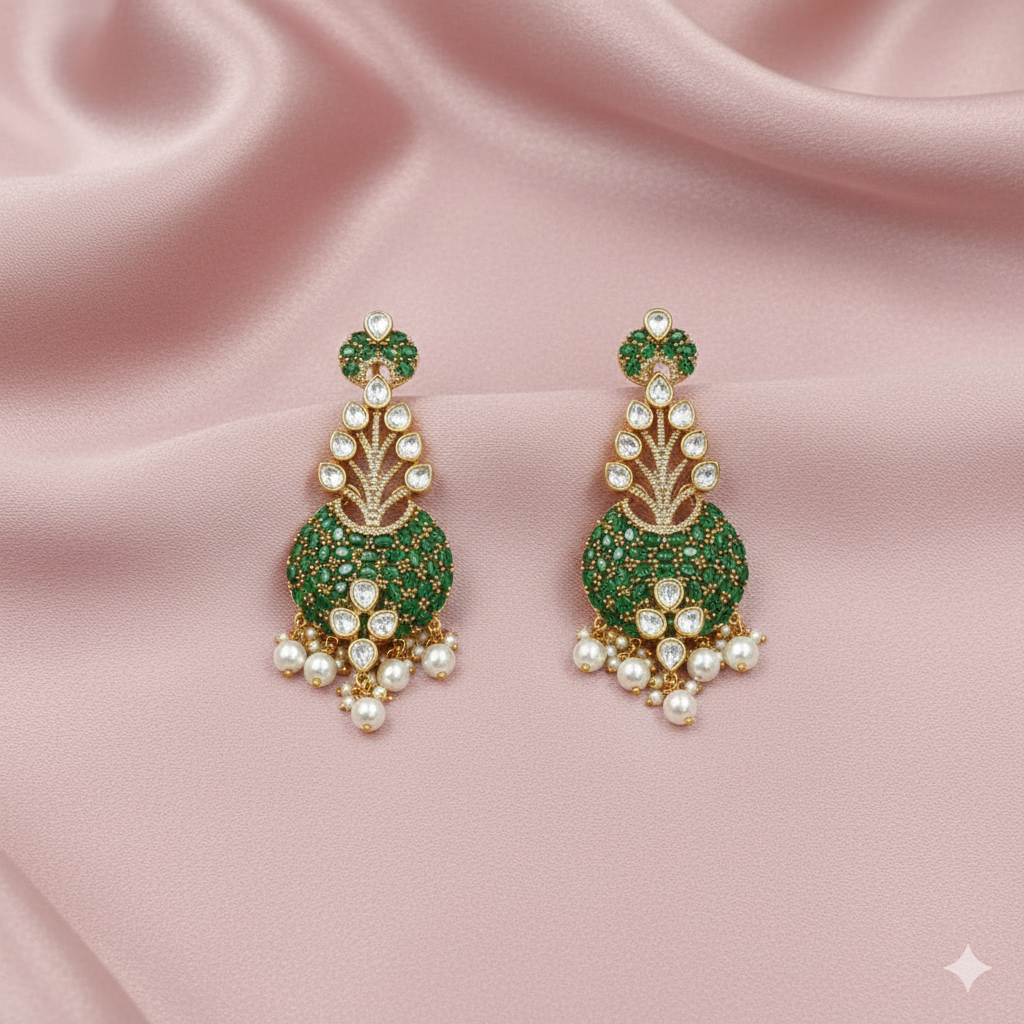 Perfect for weddings, festive celebrations, parties, and ethnic occasions, these earrings pair beautifully with sarees, lehengas, and traditional outfits. The classic combination of emerald green, pearl white, and antique gold makes this piece a versatile and luxurious addition to any jewellery collection.