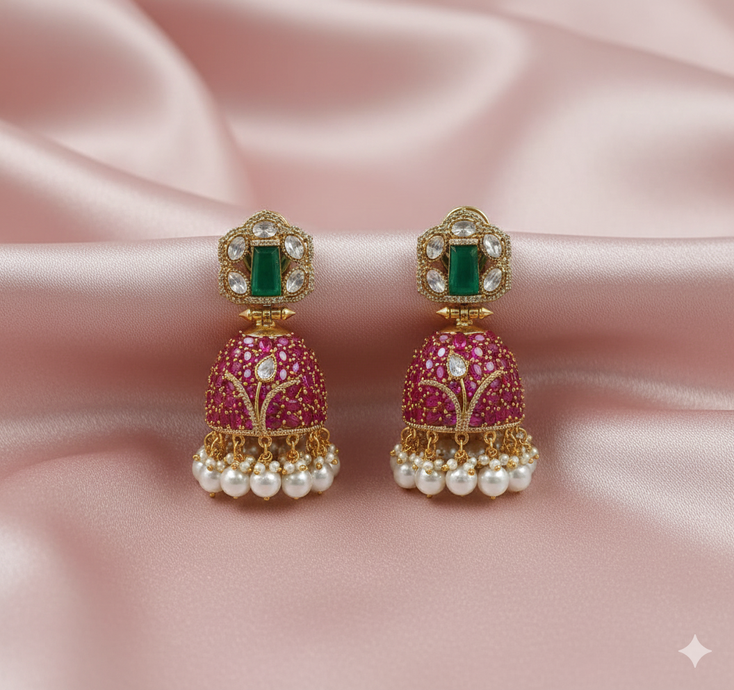 The jhumki dome is richly embellished with deep pink stones and crystal clear accents, creating a vibrant and luxurious texture. The design is completed with delicate pearl white hanging drops, adding graceful movement and traditional charm to the earrings.