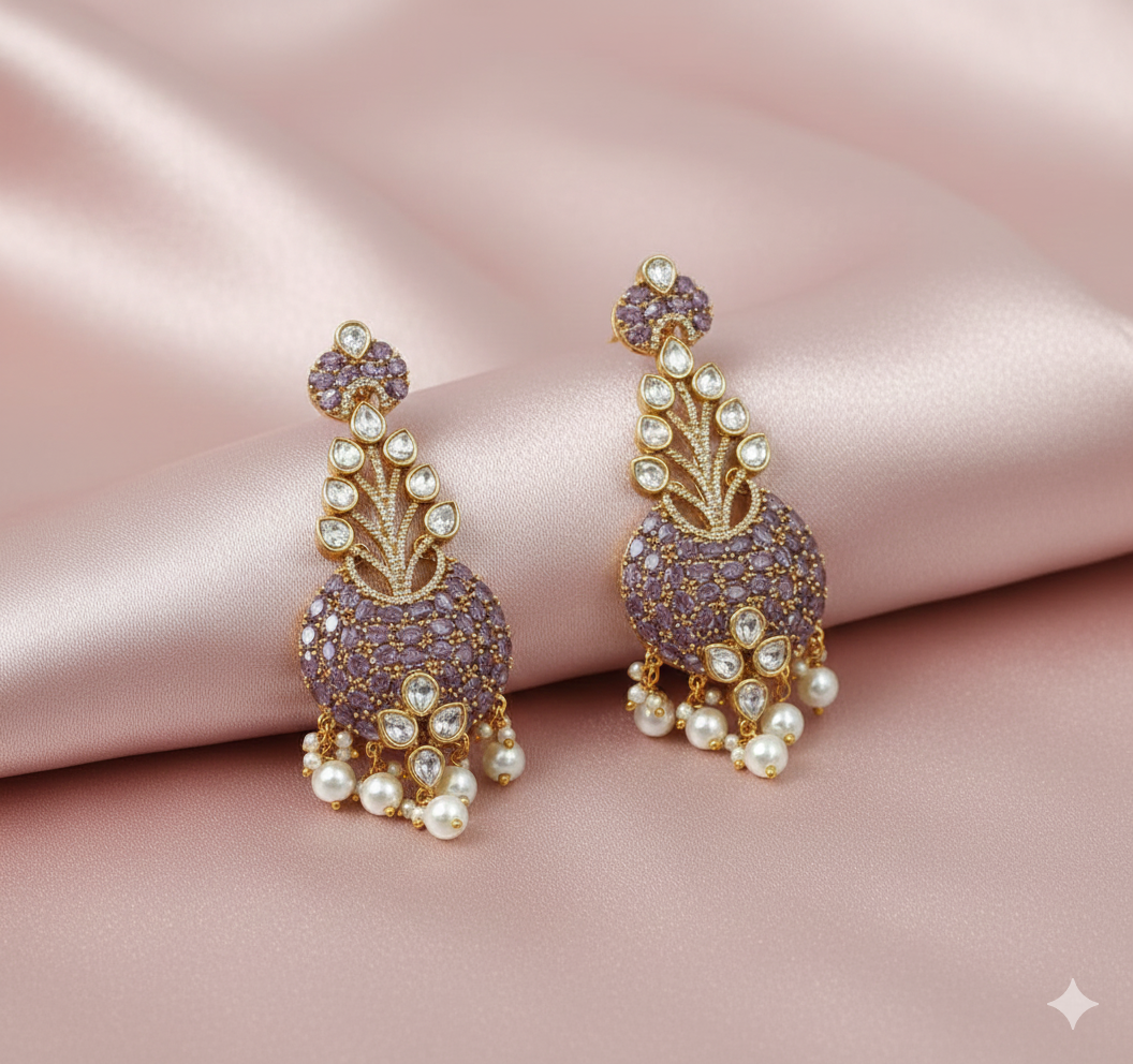 Ideal for festive celebrations, weddings, parties, and elegant ethnic looks, these earrings pair effortlessly with sarees, lehengas, and pastel-toned outfits. The soothing combination of lavender, pearl white, and antique gold creates a sophisticated and timeless appeal suitable for both day and evening wear.
