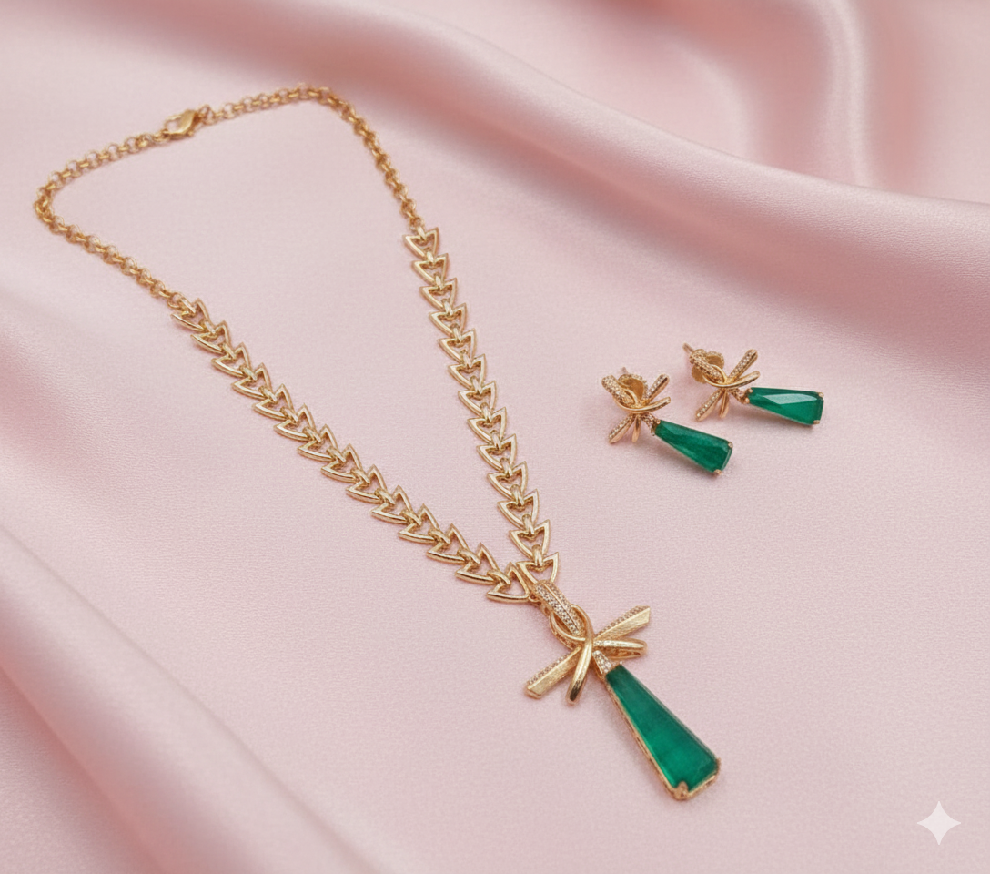 The highlight of this set is the exact emerald green color drop—deep, vibrant, and jewel-toned—adding a bold yet sophisticated contrast to the warm gold finish. The pendant is accented with a subtle bow-inspired design that enhances its graceful appeal without overpowering the look.