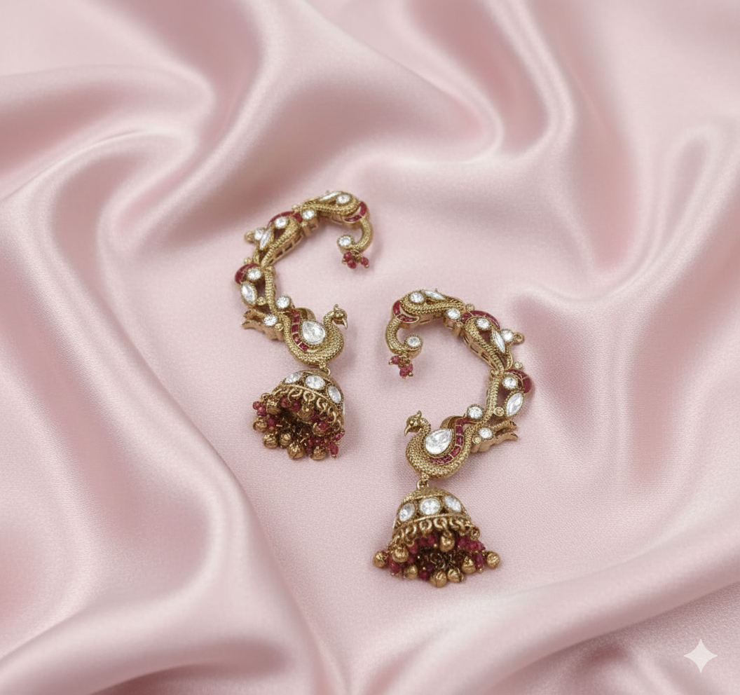 The design flows into beautifully carved jhumka drops, embellished with moissanite stones and ruby-red bead clusters that add movement and charm. The tyani style wraps elegantly along the ear, creating a statement look without the need for heavy piercings.