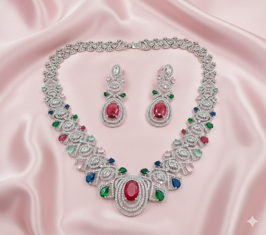 This stunning Multicolour Stone AD Necklace Set is a perfect blend of elegance, luxury, and vibrant charm. Crafted with a premium silver finish, this exquisite necklace is embellished with high-quality American Diamonds and beautifully arranged multicolour stones that add a rich and graceful appeal.