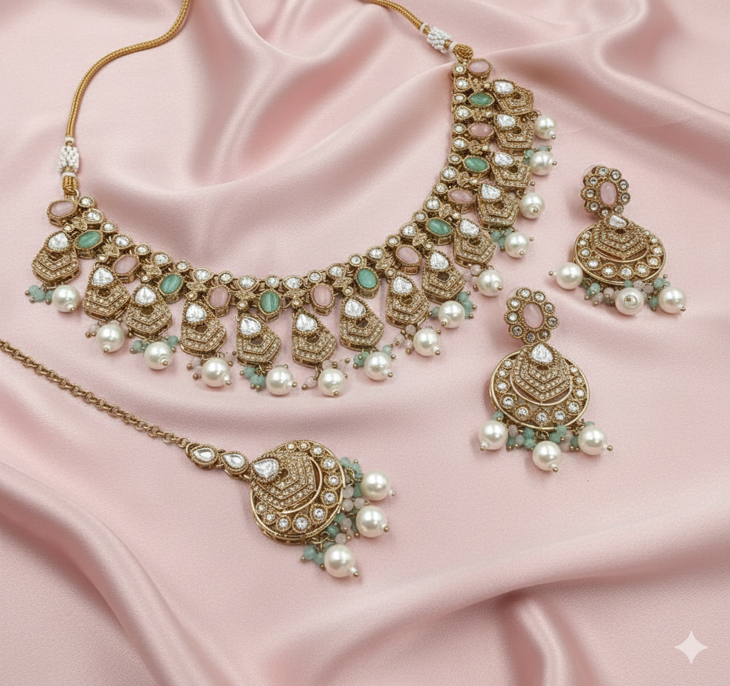 Elevate your ethnic wardrobe with this masterfully crafted Navratna-inspired set. Featuring an array of multi-colored synthetic stones—including deep reds, forest greens, and golden ambers—this set is framed by shimmering white crystals against a vintage Mehandi-finish gold base. The intricate design includes a flexible choker, majestic Jhumka earrings, and a matching Maang Tikka, all finished with delicate pearl clusters and colorful bead droplets.