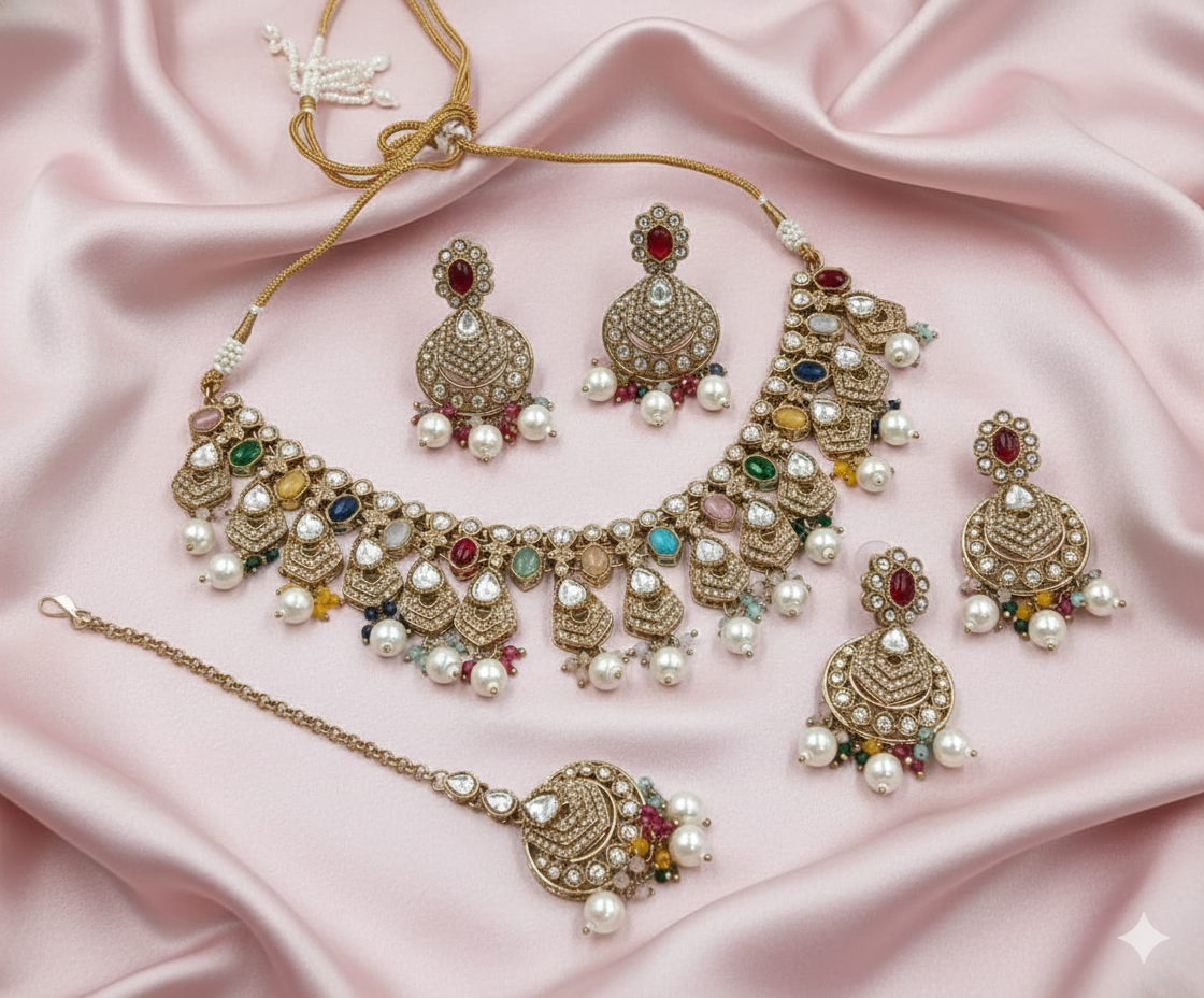 Elevate your ethnic look with our Navratna-inspired choker set. This piece features a rhythmic arrangement of multi-colored synthetic stones—including deep reds, forest greens, and golden ambers—set against a vintage Mehandi polish base. The intricate craftsmanship is highlighted by shimmering white crystal borders and delicate pearl drops. Complete with matching Jhumkas and a Maang Tikka, this set is designed to complement a wide range of attire.