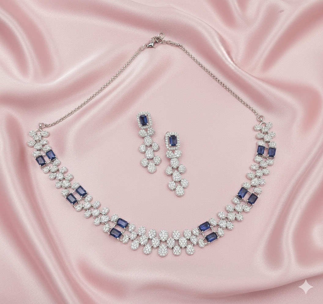 This stunning AD Necklace Set is crafted with a luxurious arrangement of brilliant white American diamonds, highlighted by royal navy blue rectangular stones that add depth and sophistication to the design. The deep navy blue color creates a classic and elegant contrast against the shimmering white stones, making the set visually striking yet timeless.