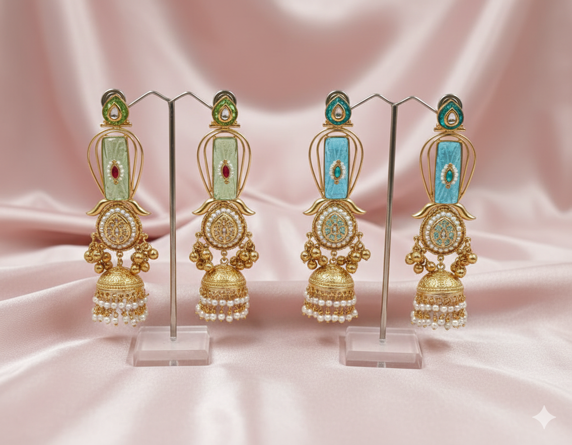 This exquisite pair features a central rectangular element framed by intricate golden peacock carvings and pearl borders. The elongated design is finished with three tiers of golden bead chains that terminate in traditional jhumki domes