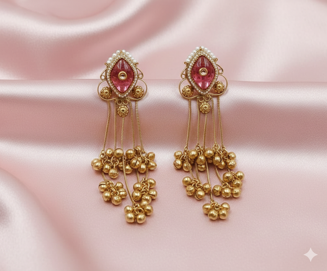 This exquisite pair features a central rectangular element framed by intricate golden peacock carvings and pearl borders. The elongated design is finished with three tiers of golden bead chains that terminate in traditional jhumki domes.