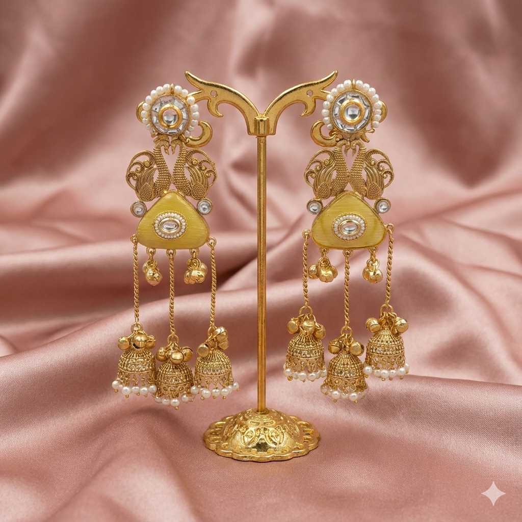 Accented with subtle kundan stones and finished with multiple dangling jhumkis adorned with pearl ghungroos, these earrings create graceful movement and traditional charm. The antique silver-look polish enhances the intricate detailing, making them perfect for festive occasions, weddings, cultural functions, and ethnic celebrations.