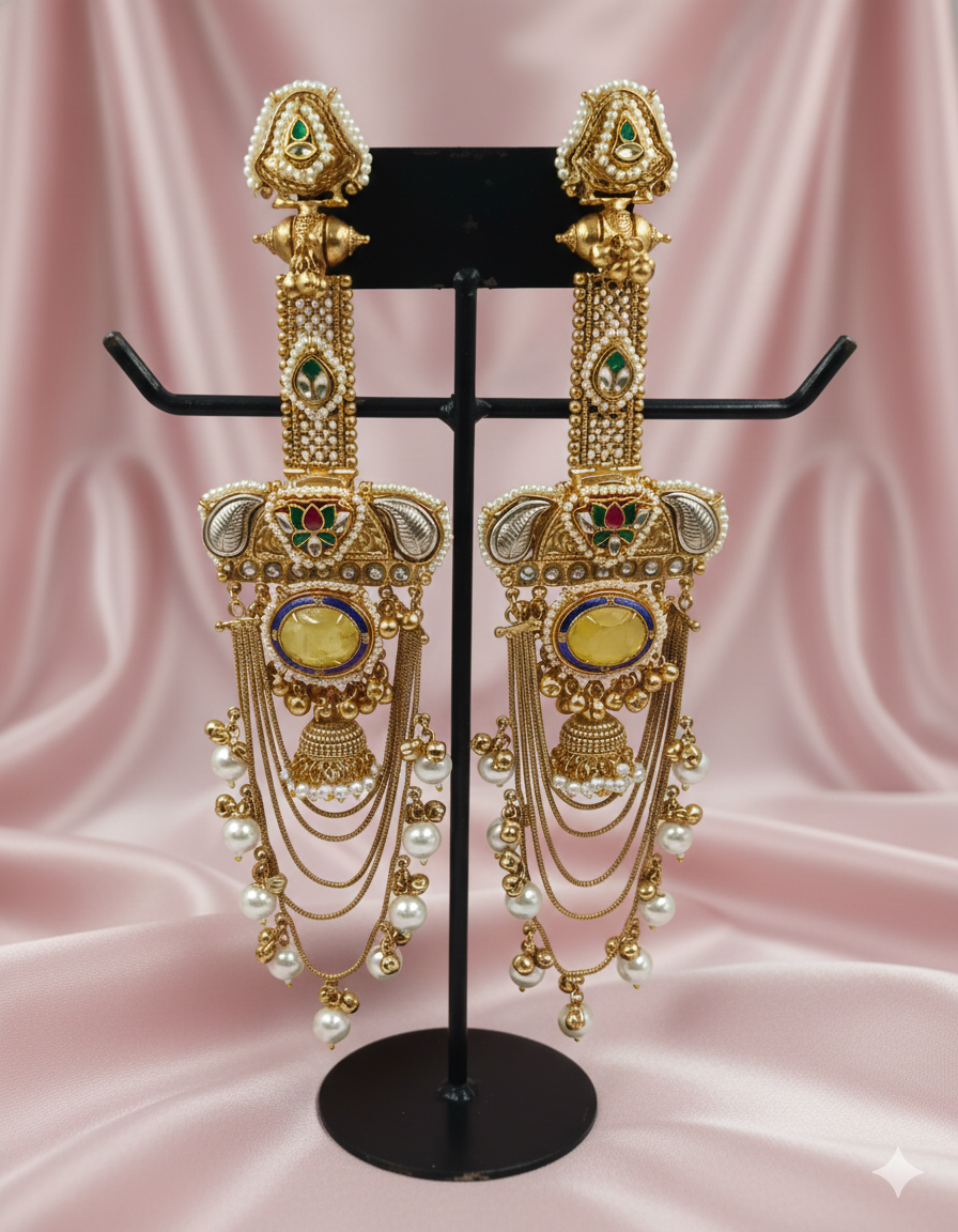 Stand out with these masterfully designed elongated heritage earrings. The piece begins with a pearl-edged triangular stud leading into a long, intricate lattice-work golden pillar. The focal point is a bold oval stone—available in Peach, Ruby Pink, Yellow, or Emerald Green—framed by a vibrant enamel border. Five delicate golden chains cascade from the base, alternating between golden beads and polished white pearls. A central bell-shaped Jhumka anchors the design, offering a balanced and regal look for any formal celebration.