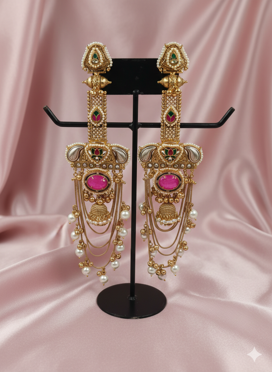 Stand out with these masterfully designed elongated heritage earrings. The piece begins with a pearl-edged triangular stud leading into a long, intricate lattice-work golden pillar. The focal point is a bold oval stone—available in Peach, Ruby Pink, Yellow, Emerald Green, or Lavender—framed by a vibrant enamel border. Five delicate golden chains cascade from the base, alternating between golden beads and polished white pearls. A central bell-shaped Jhumka anchors the design, offering a balanced and regal look for any formal celebration.