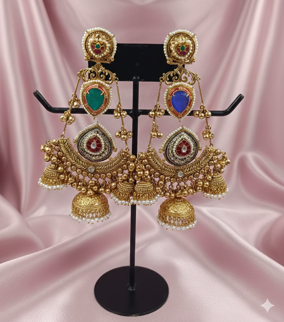 A majestic pair of multi-layered Jhumkas featuring vibrant emerald green stones and intricate antique gold-toned craftsmanship. Designed for a “Silver Look-Alike” aesthetic, these statement earrings are perfect for adding a royal touch to your ethnic wardrobe.