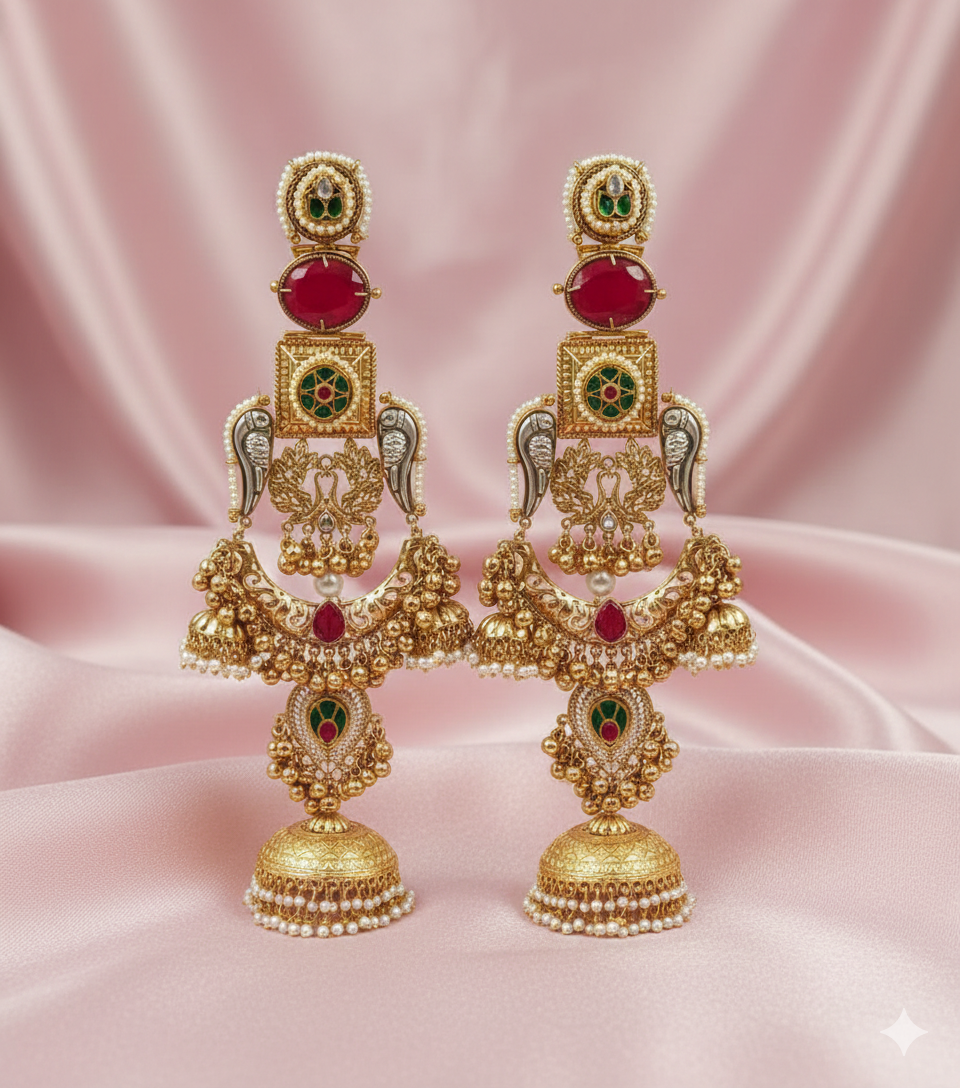Stand out with these masterfully designed elongated heritage earrings. The piece begins with a pearl-edged triangular stud leading into a long, intricate lattice-work golden pillar. The focal point is a bold oval stone—available in colors like Peach, Ruby Red, Yellow, Emerald Green, or Lavender—framed by a vibrant enamel border. Five delicate golden chains cascade from the base, alternating between golden beads and polished white pearls. A central bell-shaped Jhumka anchors the design, offering a balanced and regal look for any formal celebration.