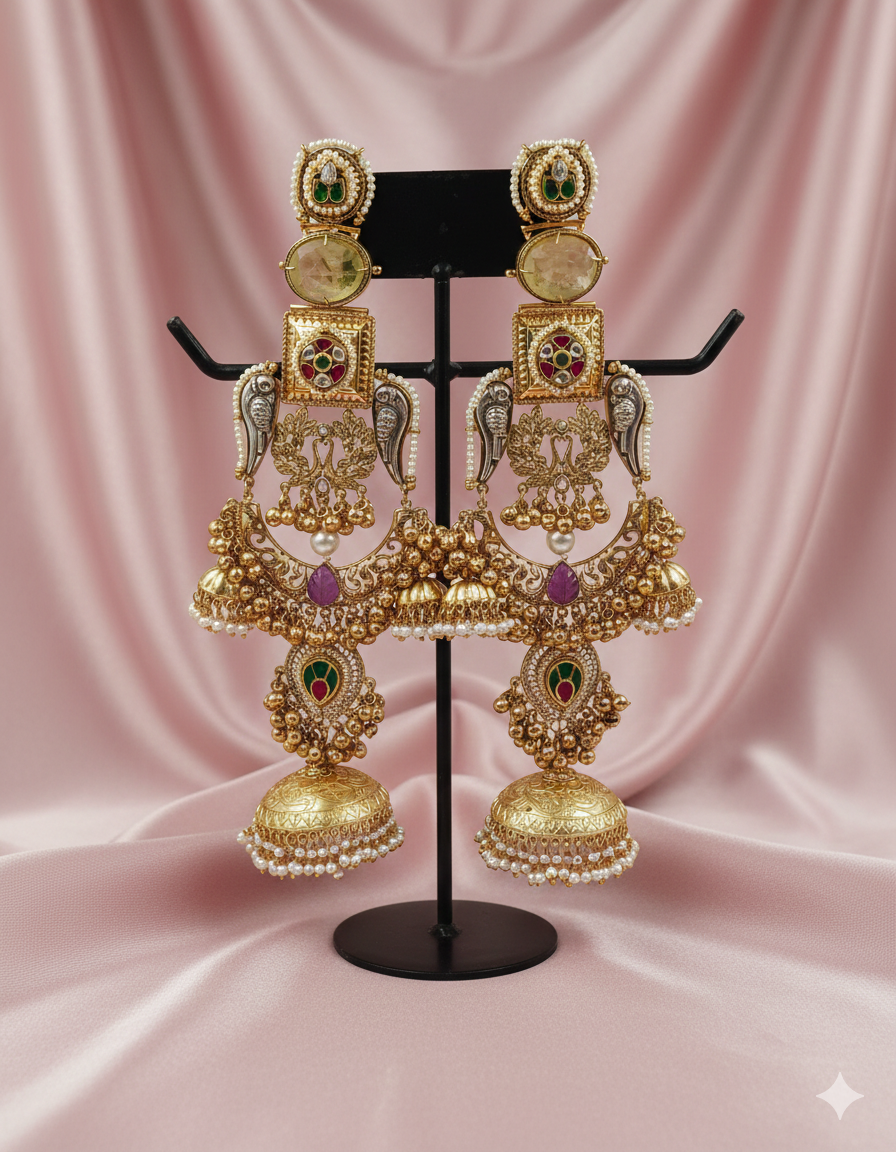 A sophisticated, ultra-long “Silver Look A Like” Jhumki featuring a detailed lattice-work pillar, vibrant oval centerstones, and cascading golden chains accented with lustrous pearls.