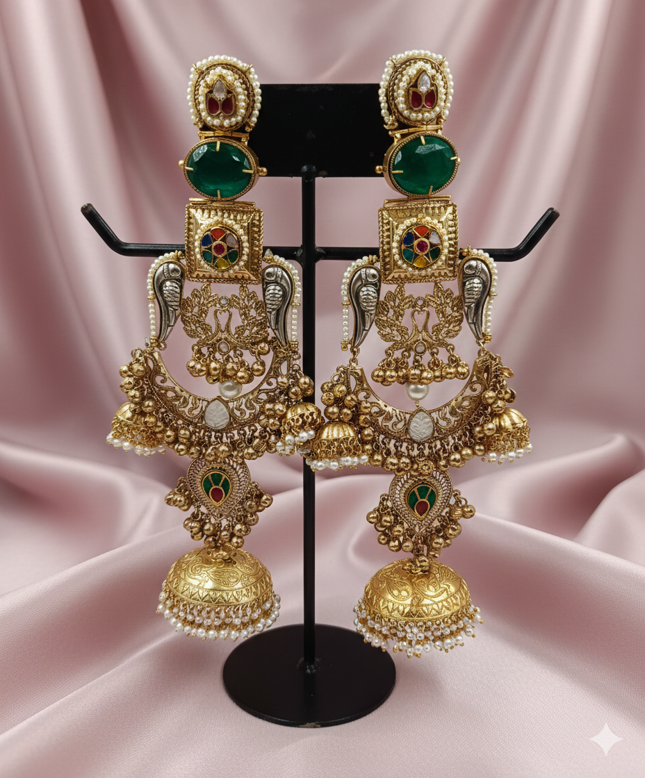 A sophisticated, ultra-long “Silver Look A Like” Jhumki featuring a detailed lattice-work pillar, vibrant oval centerstones, and cascading golden chains accented with lustrous pearls.