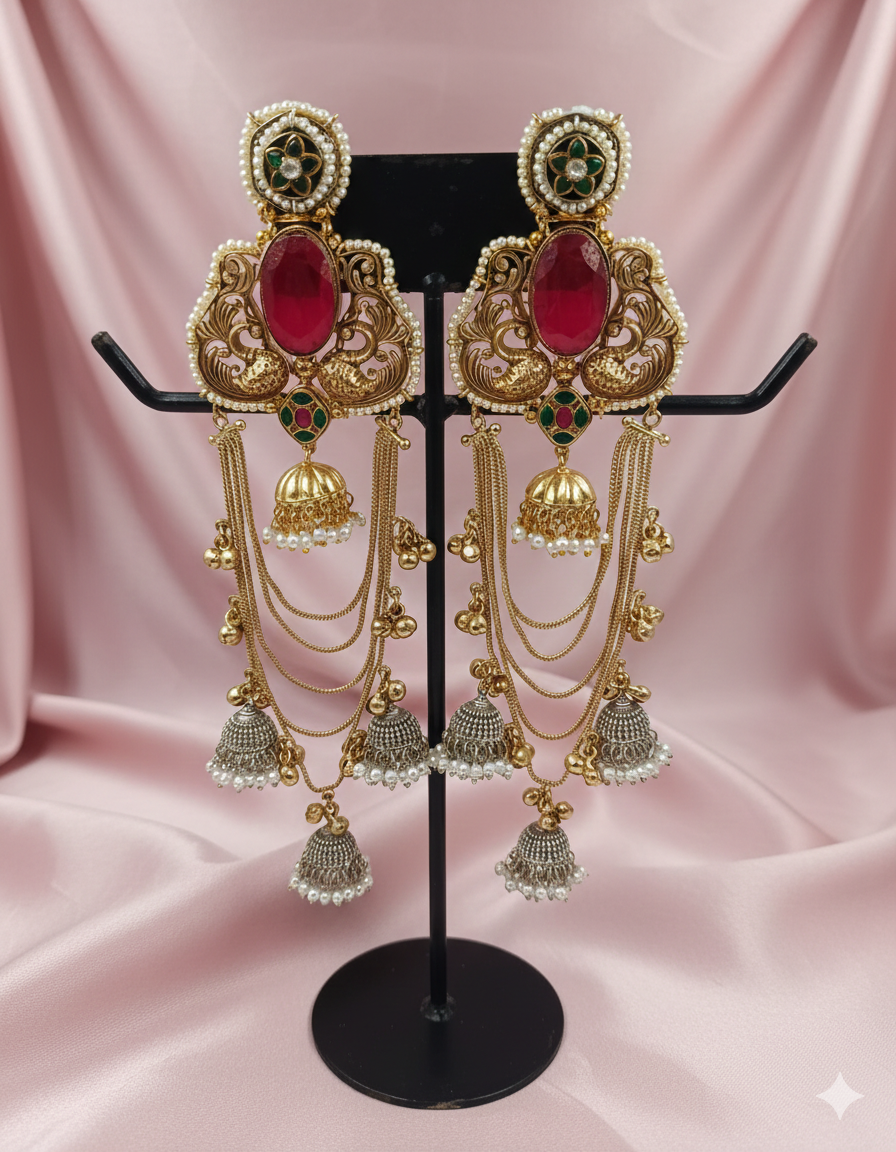 A majestic pair of multi-tiered “Silver Look-Alike” Jhumkas featuring deep emerald green centerpieces. These ornate earrings are designed to provide a grand, royal aesthetic for weddings and festive celebrations.