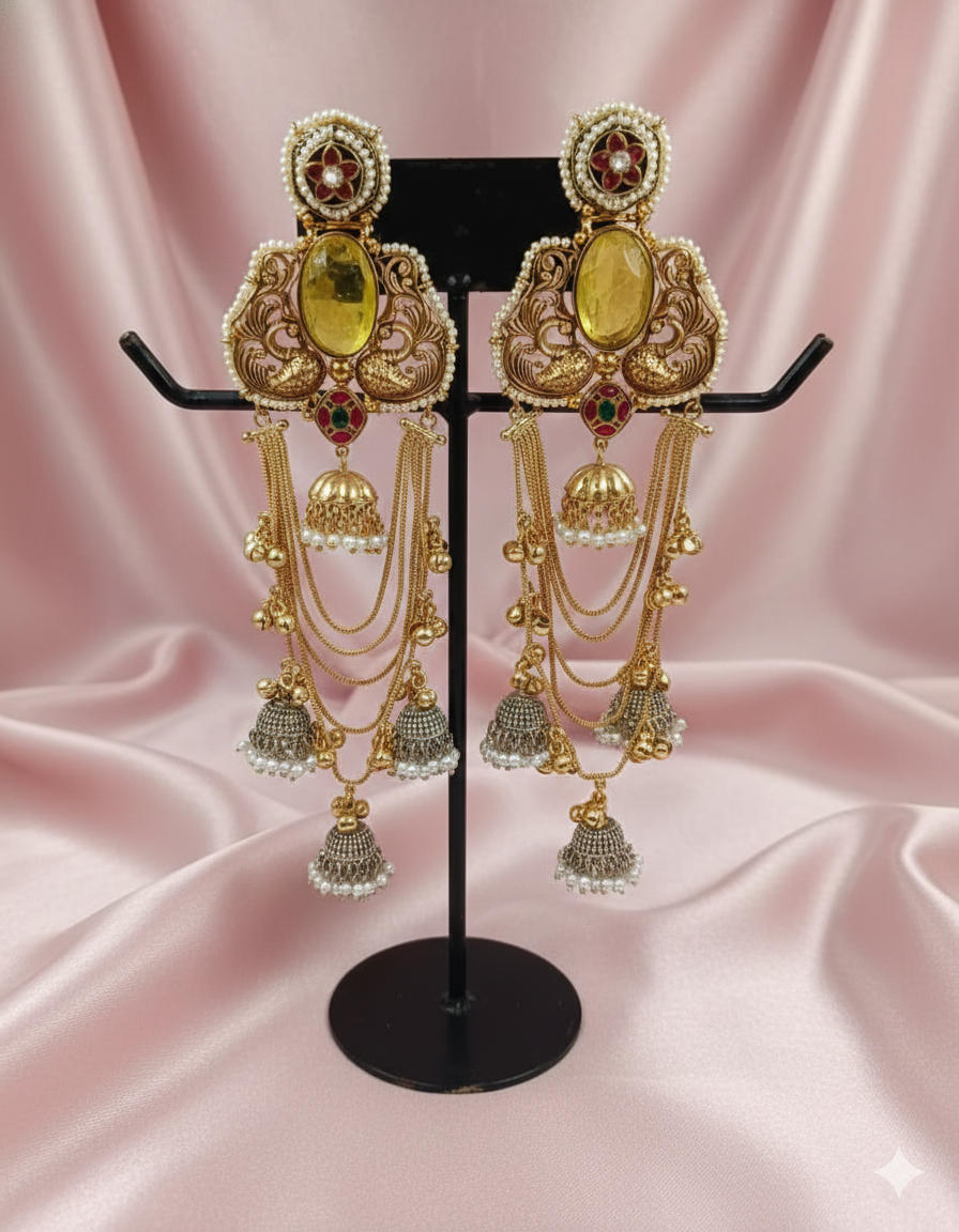 Captivate the room with these masterfully crafted Bahubali-style earrings. The design centers around a vibrant Emerald Green teardrop stone, framed by detailed antique gold-toned filigree. The three-tiered silhouette features a majestic crescent base adorned with ruby-red accents and golden dangling beads, leading to traditional bell-shaped jhumkas finished with delicate seed pearl edging. These earrings are the perfect statement piece for grand weddings and festive celebrations.