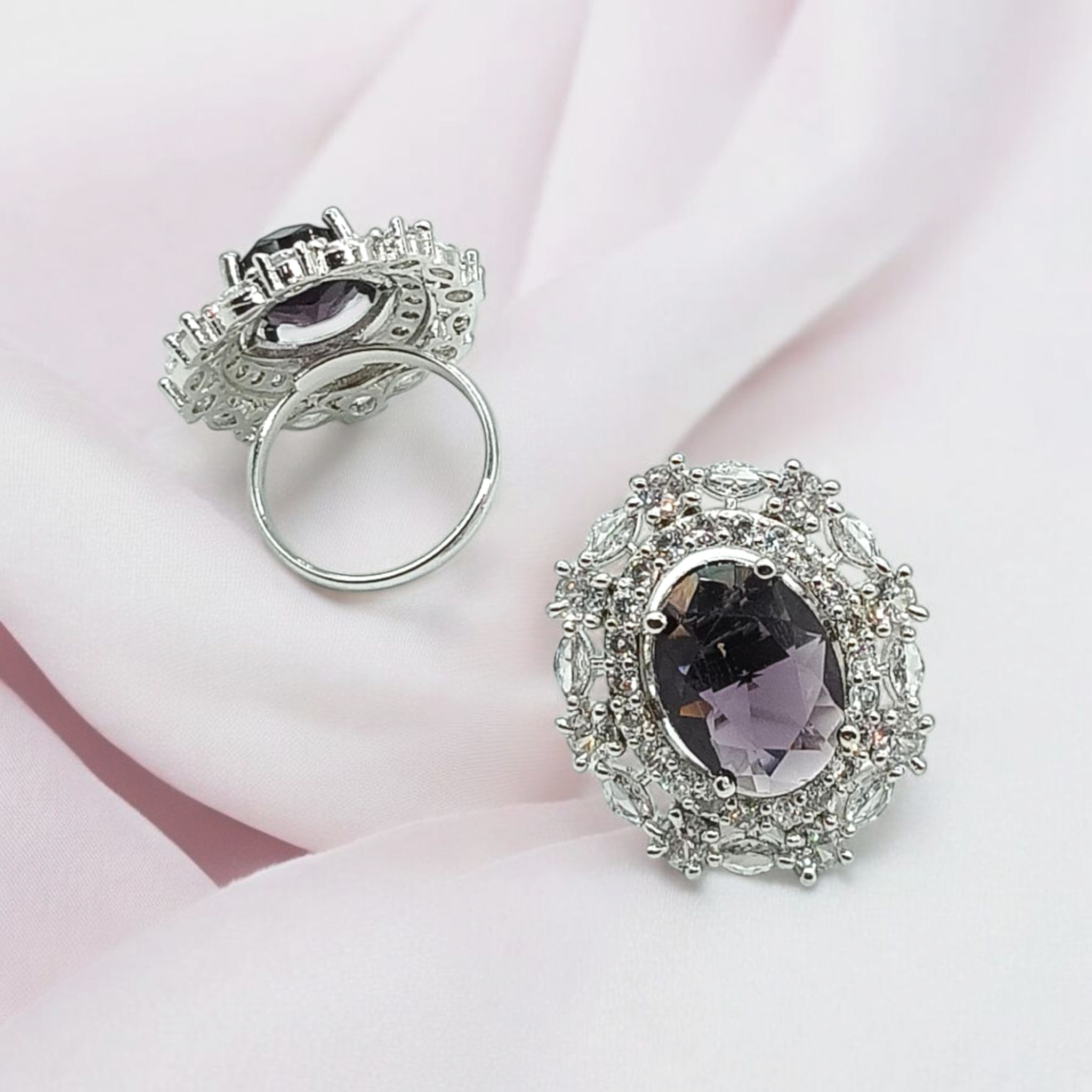 Step into elegance with this Purple AD Ring from Paramount Jewels. Featuring a radiant purple stone surrounded by sparkling American Diamonds, this ring captures the essence of grace and luxury.