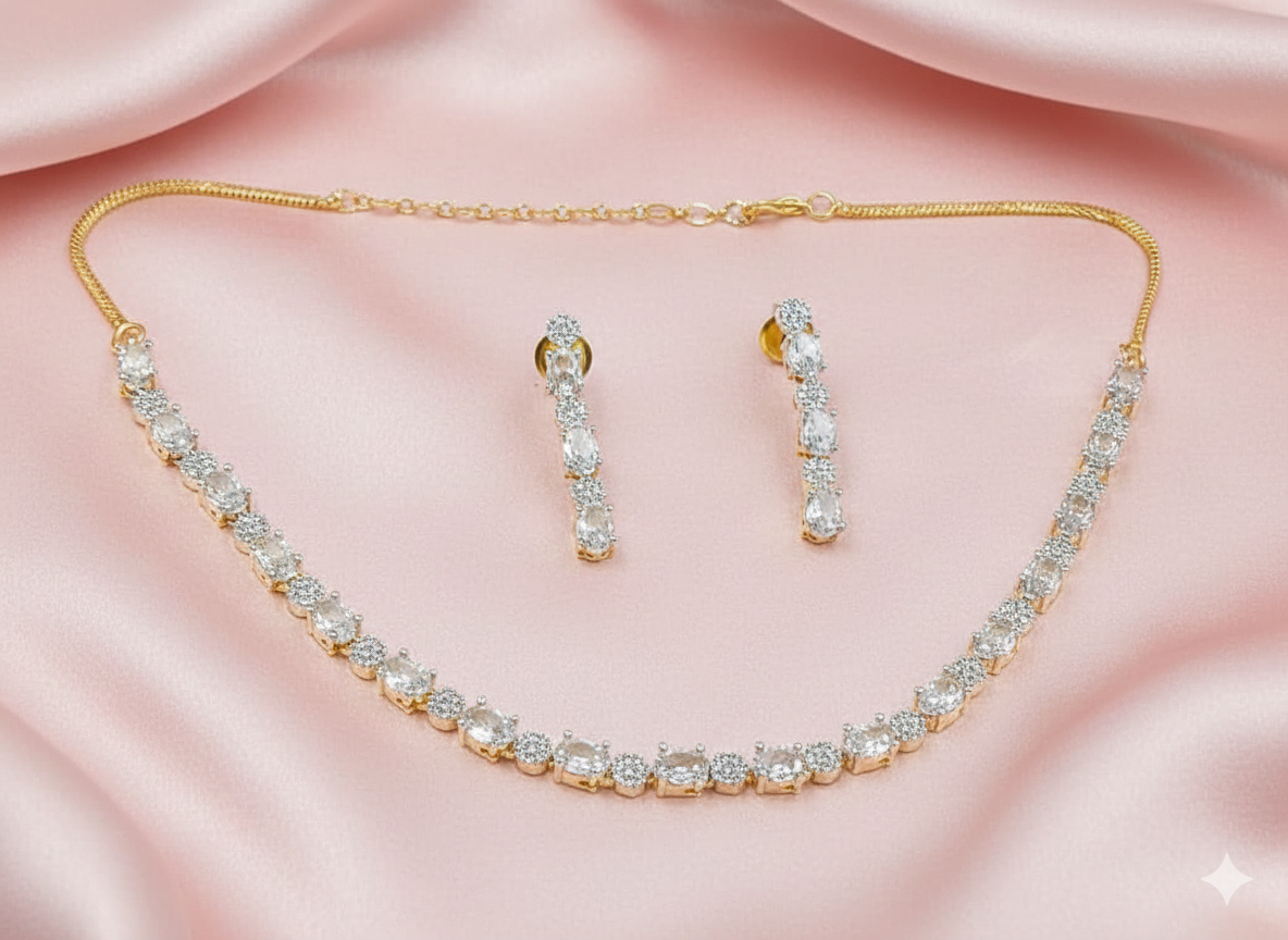 A classic and timeless gold-plated necklace set featuring brilliant oval-cut white American Diamonds (AD) paired with shimmering stone clusters. This elegant set offers a diamond-like glow, perfect for weddings, bridal wear, and sophisticated evening events