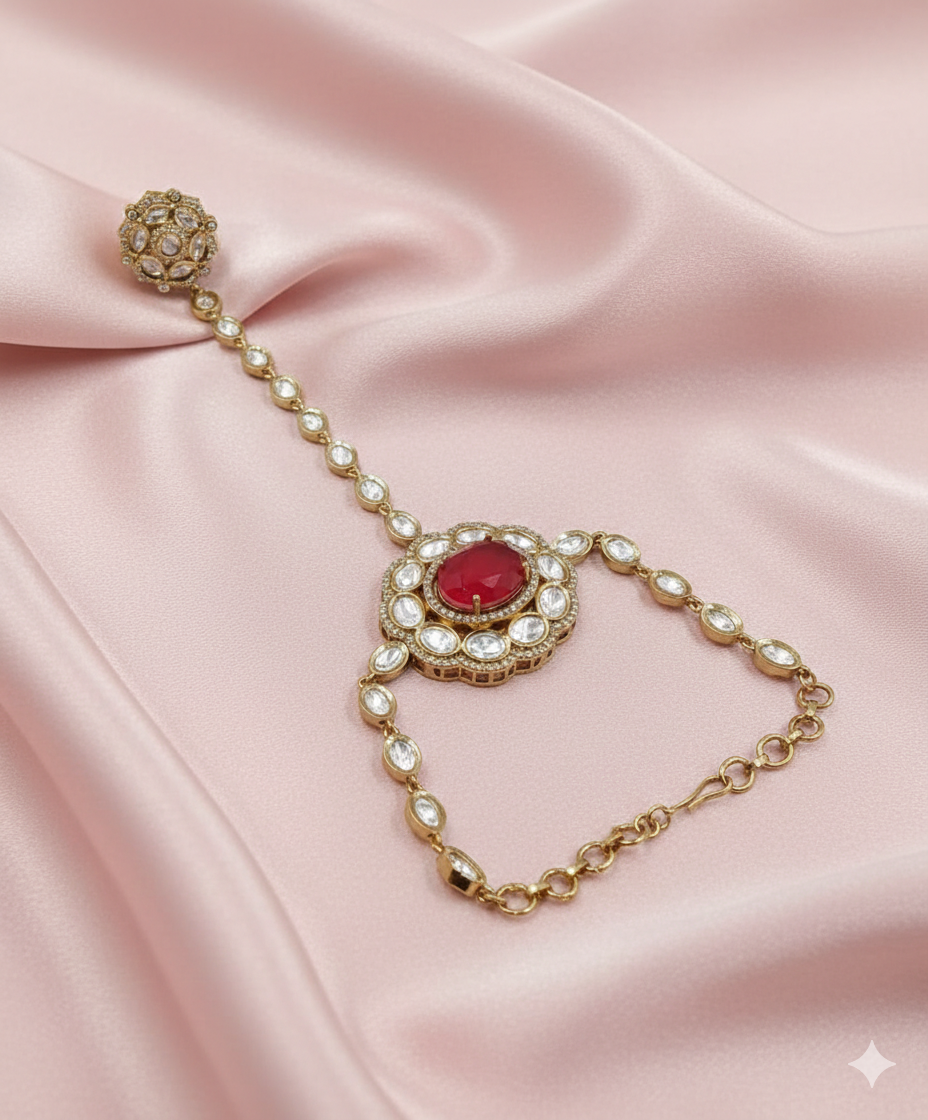 his exquisite Moissanite Hathfull is the pinnacle of traditional elegance. It features a prominent rectangular statement ring and a delicate oval centerpiece, both encrusted with brilliant-cut moissanite stones. The pieces are connected by a refined chain of bezel-set stones, leading to a secure wrist strap. Perfectly balanced with a warm gold-toned base, this accessory adds a high-shine, luxury finish to any bridal or festive look.