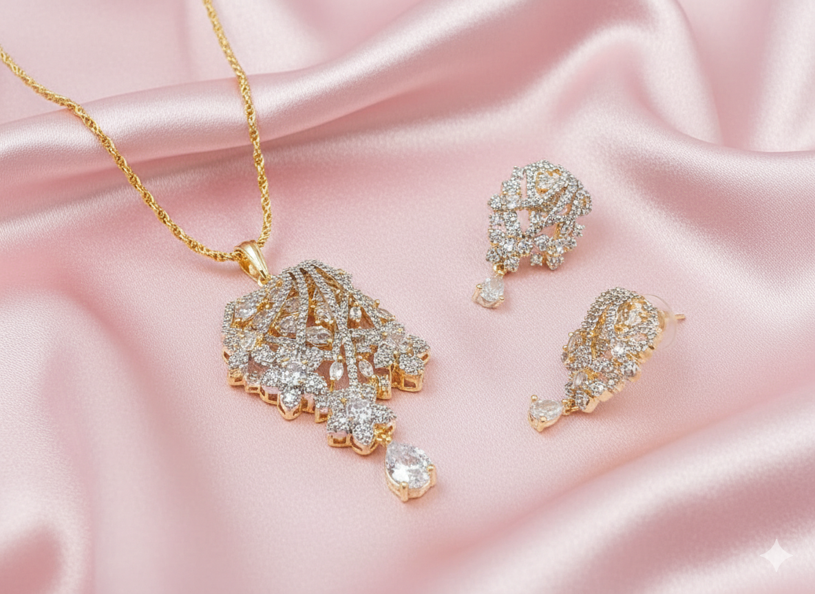 Finished in a luxurious gold-tone polish, the pendant is complemented by a delicate dangling crystal drop that adds movement and brilliance. The matching earrings echo the same artistic design, creating a perfectly balanced and elegant look.