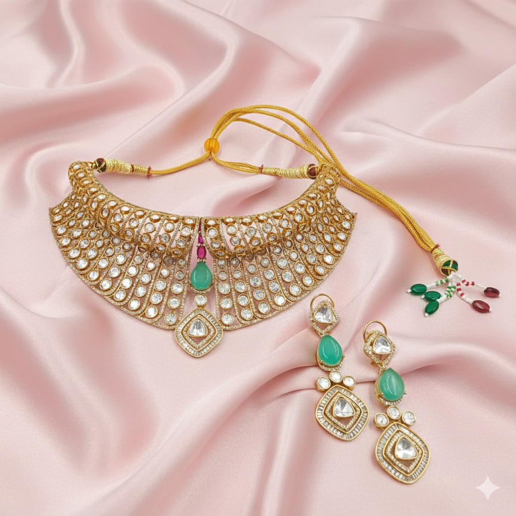 Perfect for weddings, receptions, festive occasions, and traditional celebrations, this jewellery set is ideal for those who prefer subtle colour tones with royal craftsmanship.