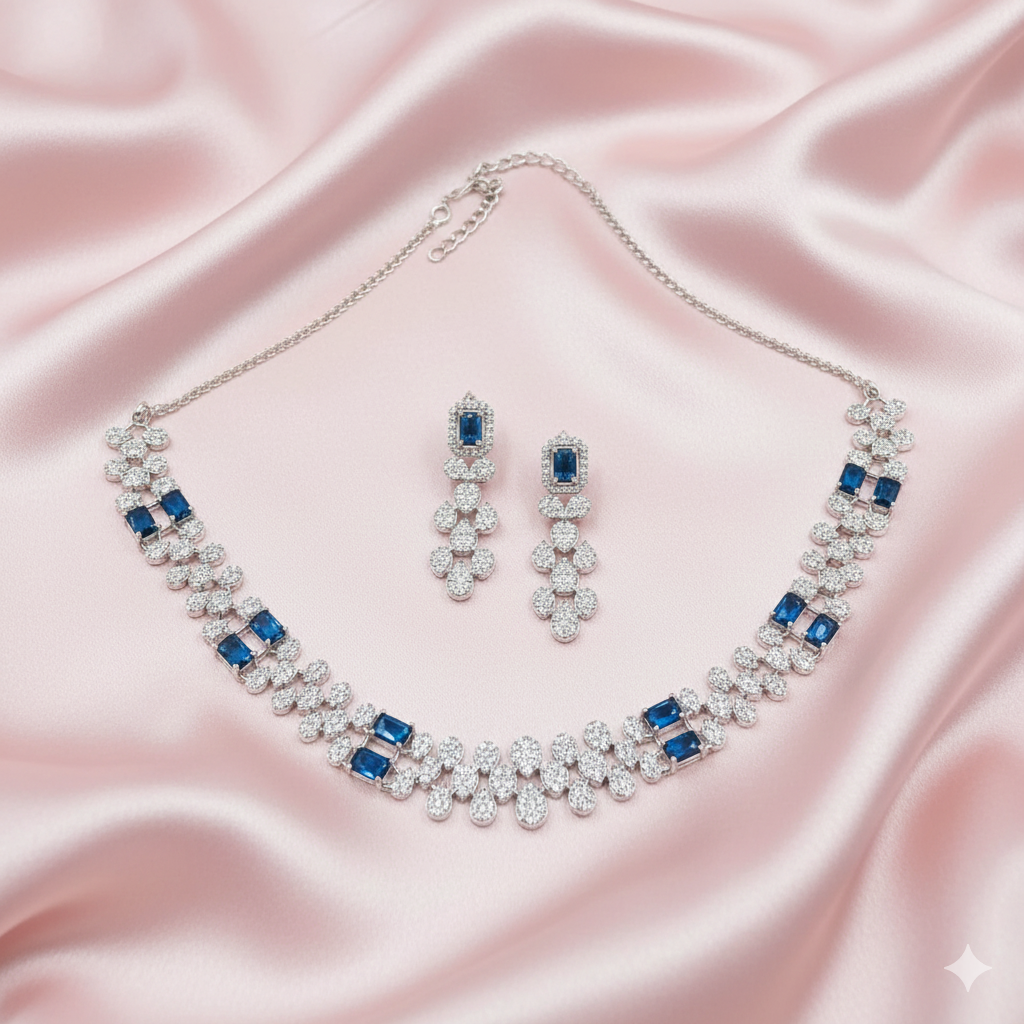 An elegant AD necklace set featuring exact royal blue stones paired with sparkling white AD stones in a refined silver finish, complete with matching drop earrings.