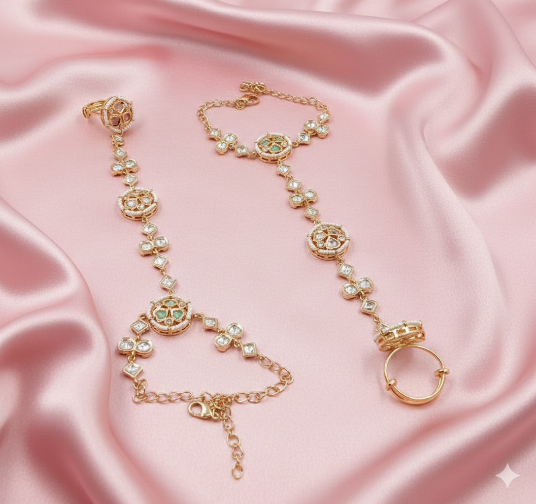Channel the opulence of royalty with this stunning Emerald Moissanite Hathfull. The piece centers on a deep, forest-green oval-cut stone encased in two layers of brilliant moissanite petals to create a majestic floral bloom. Linked to an adjustable floral-cluster ring by a delicate gold-toned chain of bezel-set stones, this accessory offers a regal contrast that is perfect for Mehendi ceremonies or traditional bridal wear.