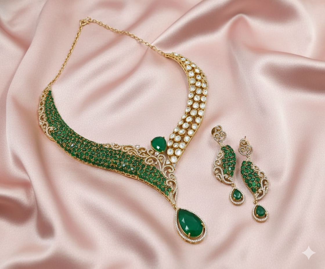 At the center, a striking emerald green teardrop stone is framed with delicate white stone detailing, forming a captivating focal point. The matching earrings echo the same design elements, combining emerald green stones, white crystal accents, and graceful gold detailing for a perfectly coordinated finish.