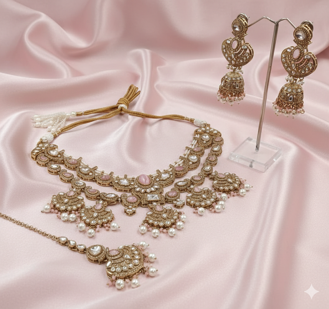 This stunning ensemble captures the essence of heritage royalty. The set features a wide choker adorned with teardrop and oval-shaped emerald green stones, encircled by shimmering white crystals against a matte Mehandi-finish gold base. The look is completed with majestic Jhumka earrings and a matching Maang Tikka, all finished with delicate pearl droplets.