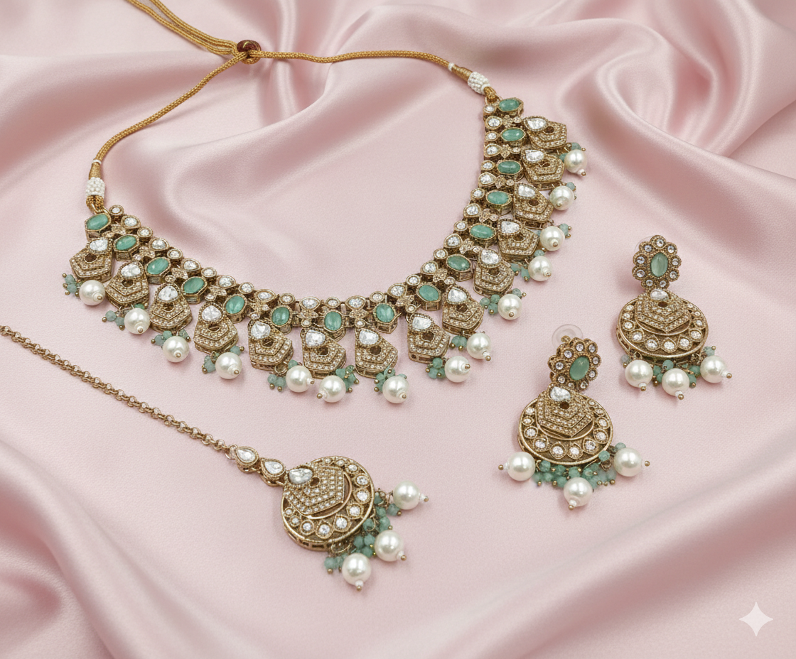 Adorn yourself in timeless elegance with this masterfully crafted ensemble. The set features a wide choker adorned with teardrop and oval-shaped emerald green stones, encircled by shimmering crystals. Perfect for weddings and festive celebrations, it includes matching Jhumkas and a Maang Tikka finished with delicate pearl droplets.