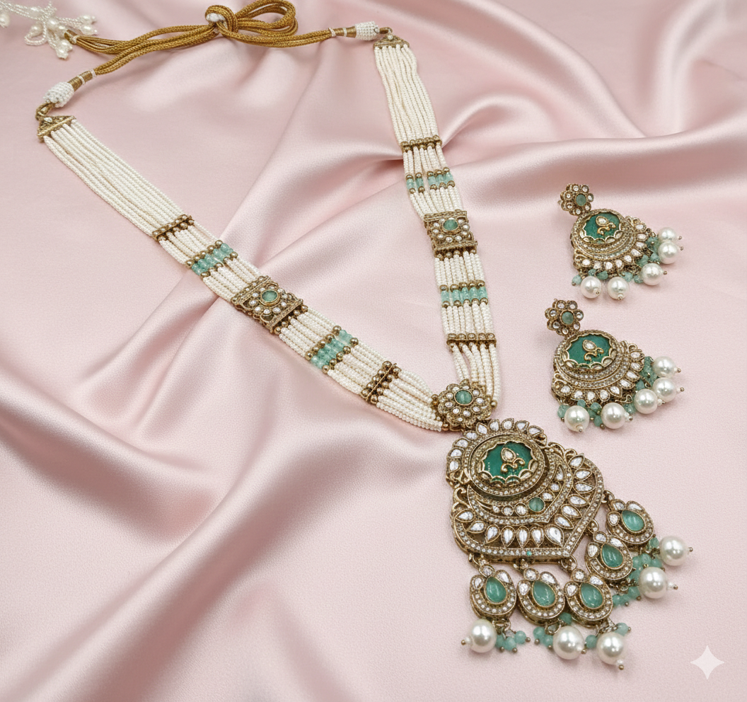 Channel timeless heritage with our Royal Emerald Long Set, where deep jewel tones meet vintage artistry. The “Mehandi Polish” provides a unique, muted gold finish that perfectly complements the richness of the emerald green stones.