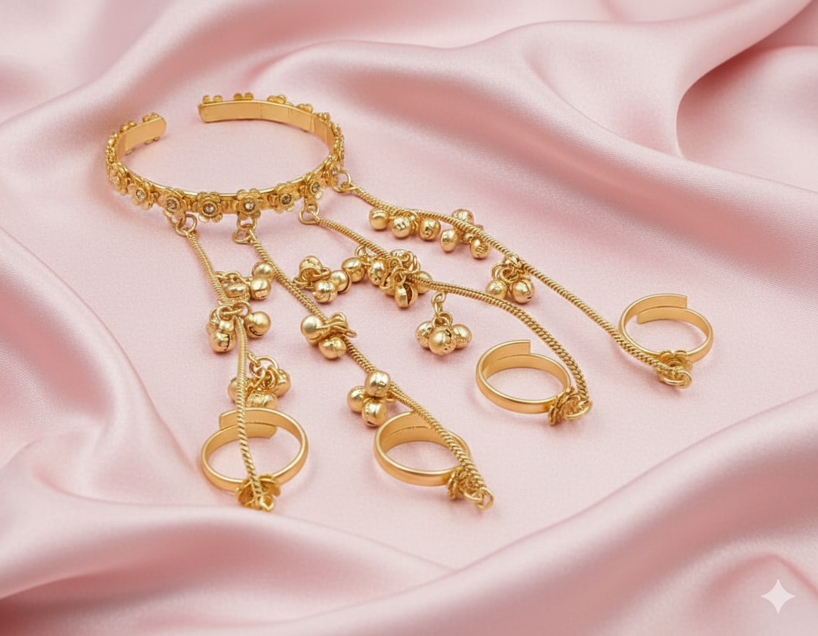 Channel the opulence of royalty with this stunning Silver Look-alike Hathphool. The piece centers on a deep, rich oval-cut stone encased in two layers of brilliant crystal petals to create a majestic floral bloom. Linked to an adjustable floral-cluster ring by a delicate gold-toned chain of bezel-set stones, this accessory offers a regal contrast perfect for traditional bridal wear.
