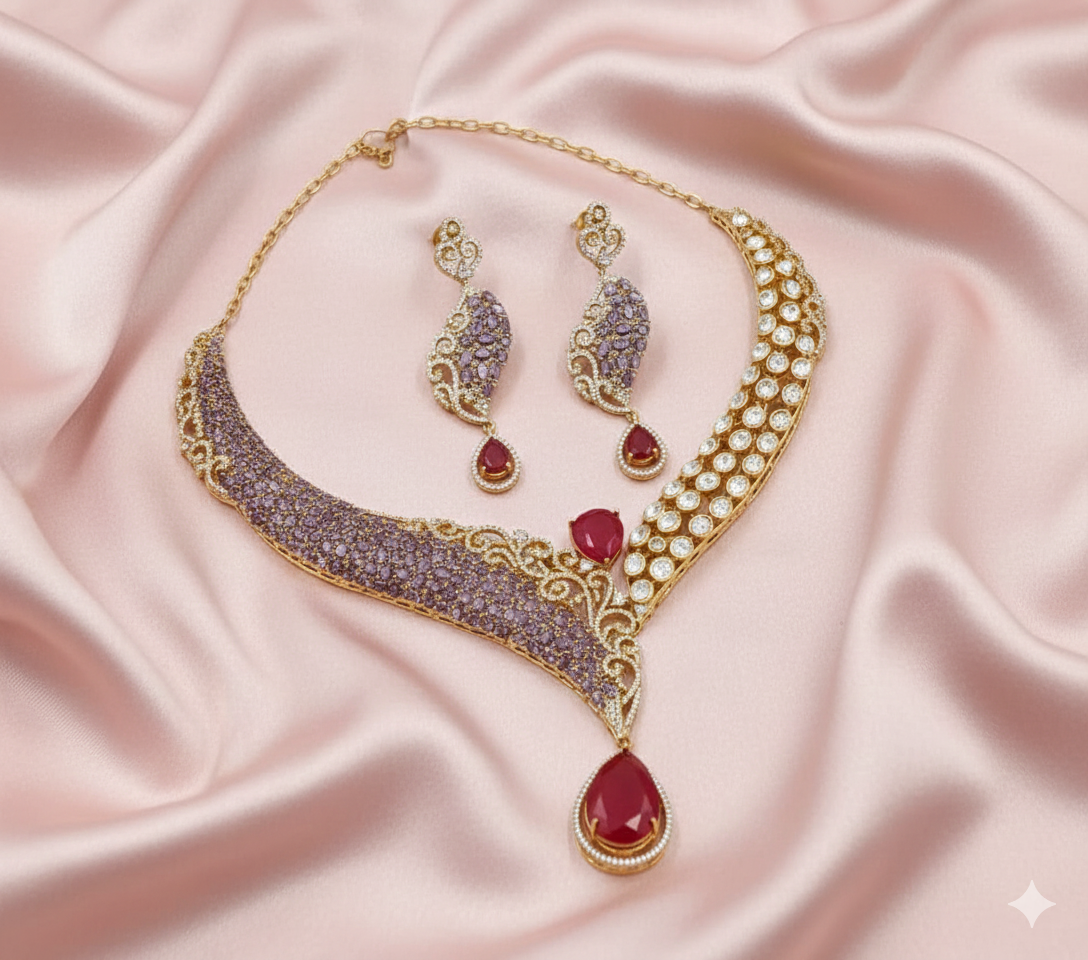 At the center and drop, deep ruby-red teardrop stones bring a bold, royal touch, perfectly balanced by intricate gold filigree work. The set is completed with matching earrings, mirroring the lavender crystals, white stone accents, and ruby-red drops for a coordinated, elegant finish.