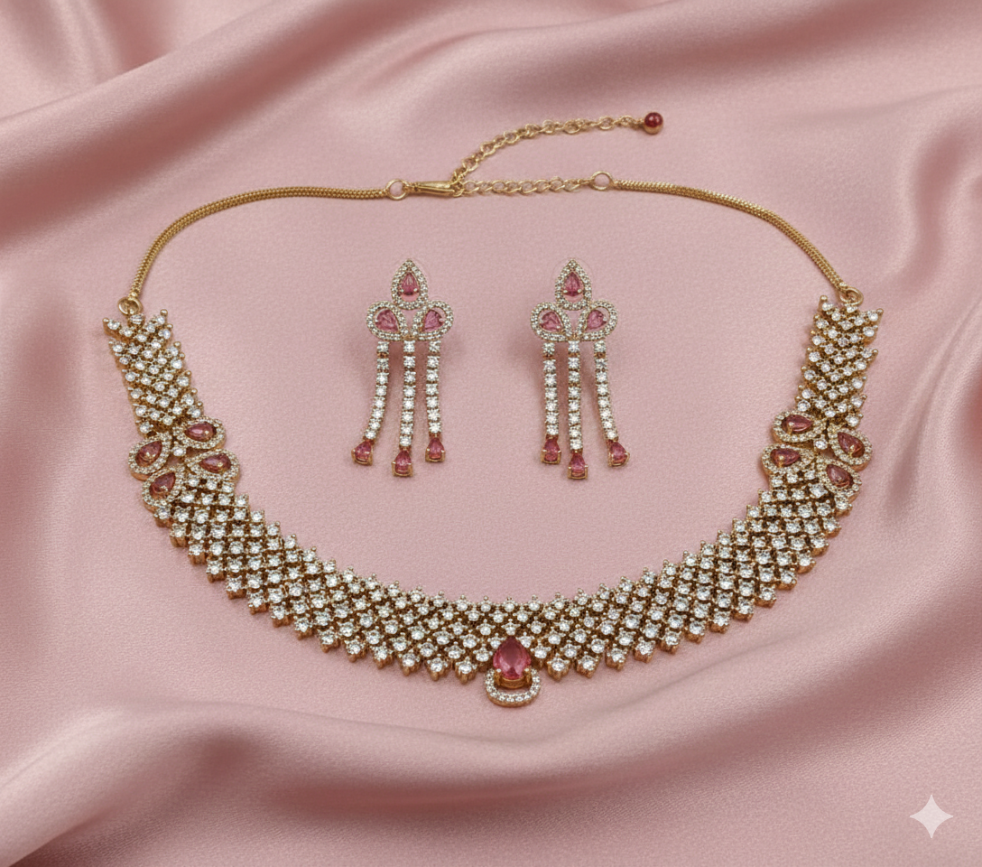 Exude luxury with this intricately crafted American Diamond (AD) Choker Set. Designed to capture the light from every angle, the necklace features a broad, flexible mesh pattern meticulously studded with high-grade clear stones.