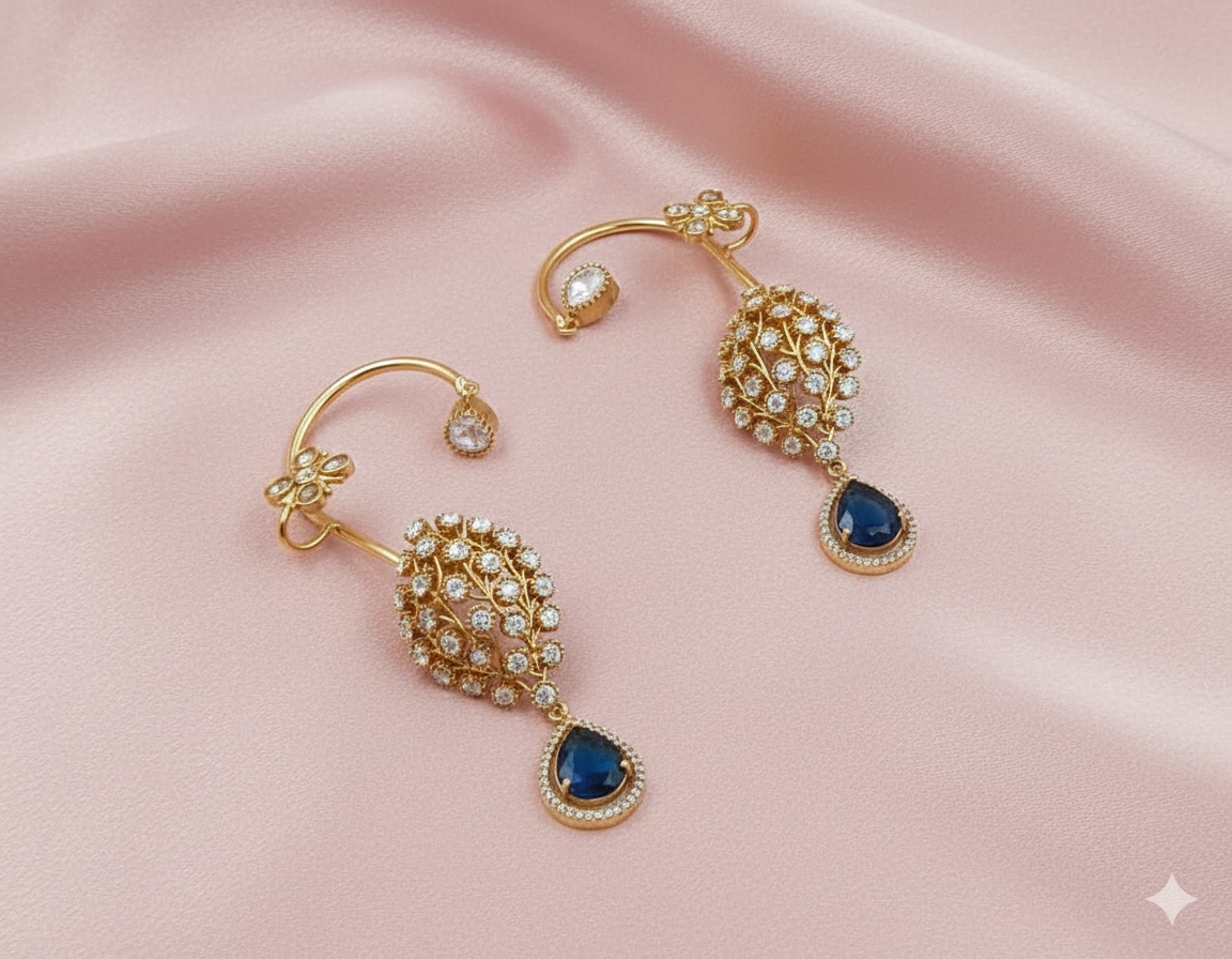 Elevate your luxury collection with these stunning Moissanite Earcuffs. Meticulously crafted with a premium gold-tone finish, the design features an intricate vine-like structure studded with shimmering Moissanite stones. A deep blue, pear-cut sapphire-style stone dangles from the base, surrounded by a delicate halo of crystals to add a touch of royal contrast. The curved “cuff” design allows for a secure and comfortable fit that follows the natural line of the ear, making them the perfect choice for high-end weddings, receptions, or festive celebrations.