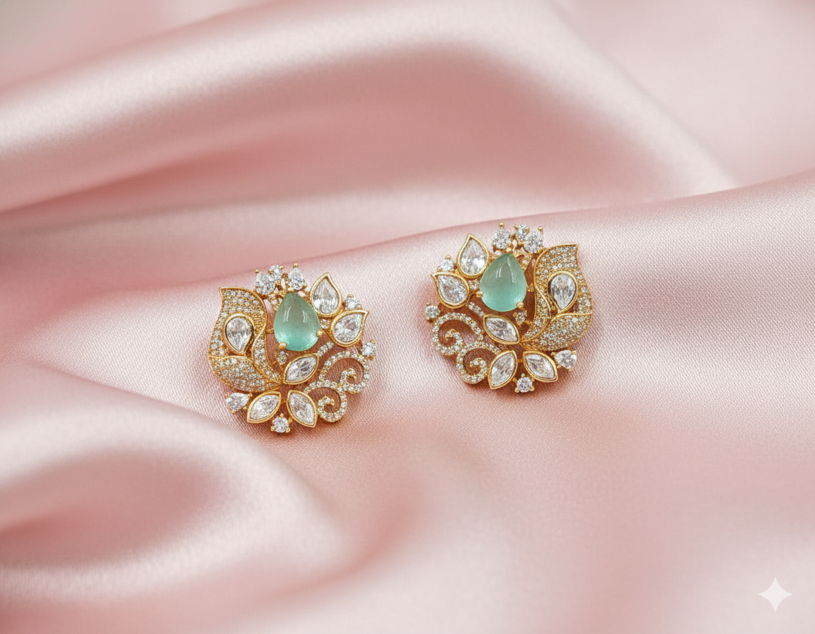 Elevate your ensemble with these majestic Moissanite Tops. Meticulously crafted with a premium gold-plated finish, these round studs feature an intricate filigree design reminiscent of a peacock’s grace. The piece is adorned with shimmering Moissanite crystals and centered with a smooth, teardrop-shaped mint green stone, offering a perfect blend of tradition and contemporary elegance