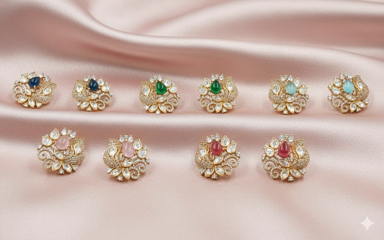 Elevate your ensemble with these majestic Moissanite Tops. Meticulously crafted with a premium gold-plated finish, these round studs feature an intricate filigree design reminiscent of a peacock’s grace. Each piece is adorned with shimmering Moissanite crystals and centered with a smooth, teardrop-shaped gemstone, offering a perfect blend of tradition and contemporary elegance.