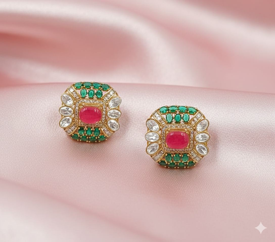 Elevate your ethnic ensemble with these stunning Moissanite Tops. Meticulously crafted with a premium gold-plated finish, these square-shaped studs feature a bold, oval-cut synthetic ruby center. The design is intricately bordered by rows of rich emerald-green stones and large, clear Moissanite Polki crystals that capture the light from every angle. These statement studs offer a heavy, royal look while remaining comfortable for long-wear use, making them an ideal choice for weddings, receptions, and grand celebrations.