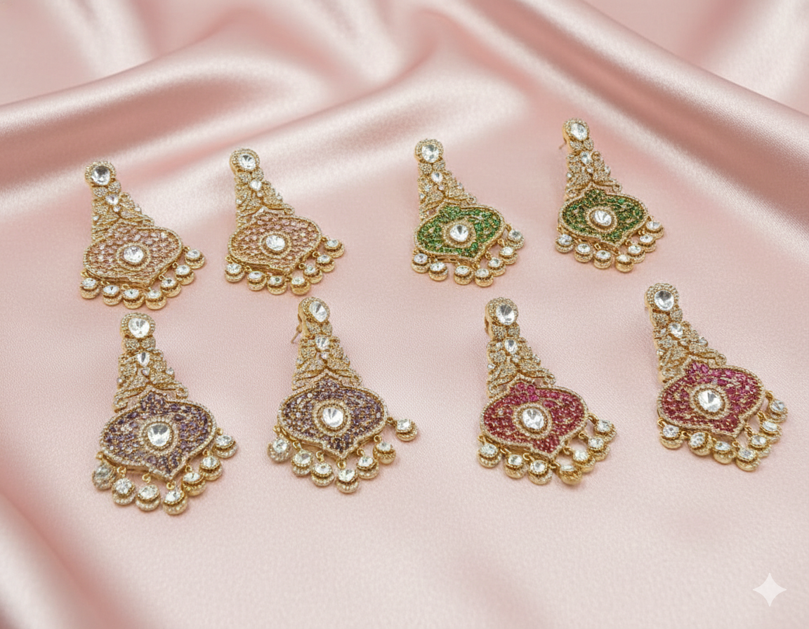 Add a touch of regal charm to your jewelry box with our Royal Multi-Stone Moissanite collection. Each pair is meticulously crafted with a high-shine gold-tone base, showcasing a brilliant central Moissanite surrounded by a vibrant mosaic of micro-stones. The design features a delicate vine-like top that flows into a bold teardrop silhouette, finished with five shimmering crystal drops for added movement and grace. Whether you choose the soft peach or the deep ruby, these earrings offer a luxurious, high-end look perfect for weddings, galas, and traditional celebrations.
