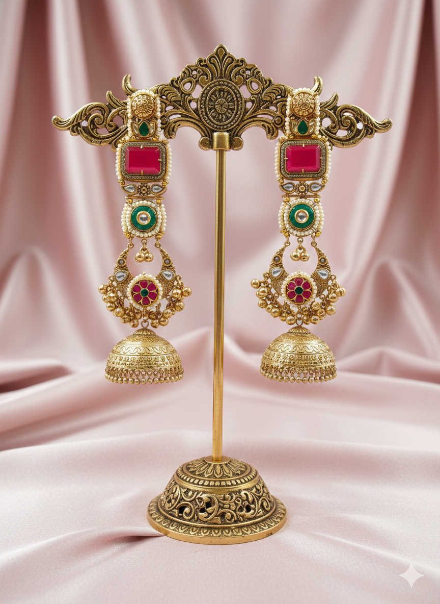 Introducing the Royal Pink & Green Silver Look-Alike Jhumki—a stunning pair of earrings crafted with rich detailing and a premium handcrafted feel. Although built on a silver-look framework, this jhumki carries an elegant antique gold finish, giving it the authentic charm of traditional temple jewellery. Perfect for weddings, festive occasions, cultural events, and traditional celebrations, these jhumkis instantly elevate any ethnic outfit.