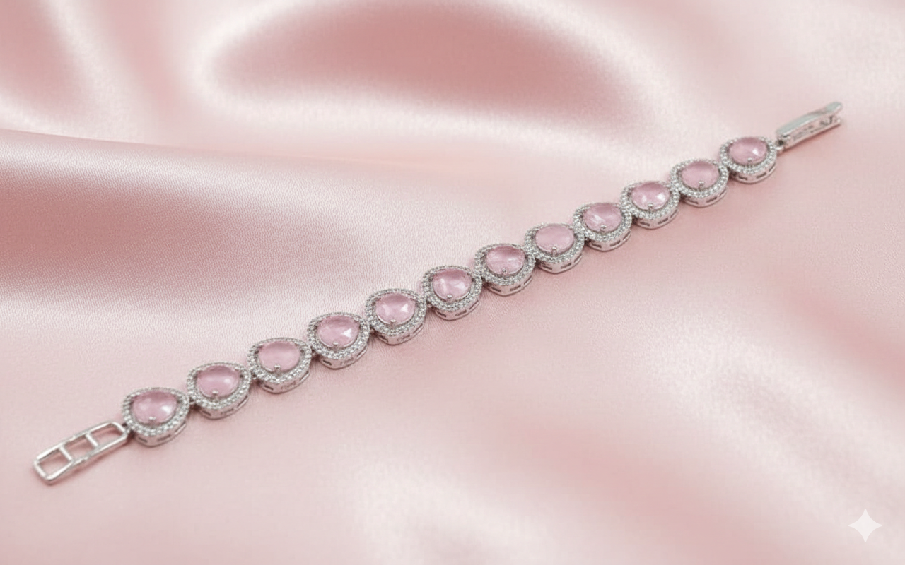 Cohesive Finish: Each alternating stone is individually set within a sparkling diamond halo for a unified appearance. sequence of Mint Green and Rose Pink round stones, creating a harmonious and playful accessory.