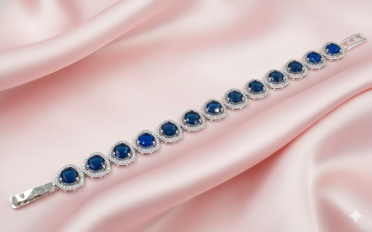 Elevate your ensemble with the deep brilliance of our Sapphire Blue AD Bracelet, featuring square-cut stones framed by a shimmering halo.